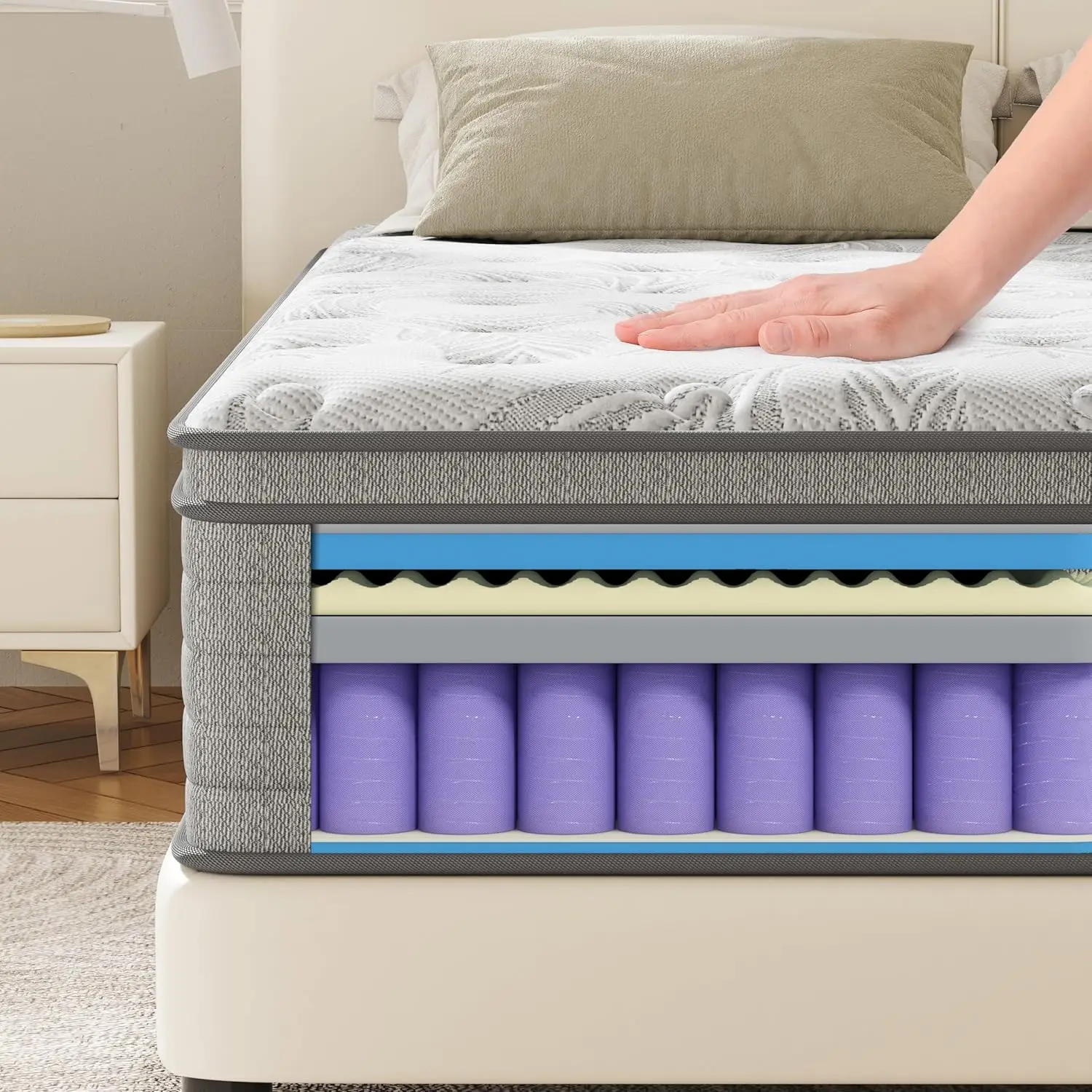 MOTION ISOLATION:14 inch cal king mattress support system is constructed by hundreds of individual pocketed stainless steel spring coils that are excellent for shock-absorption and resilience and help adjust and sleep easier and harder. Whole mattress adopted individual pocket coils provide adequate support for proper spinal alignment and absorb motion disturbances between partners, allowing you to sleep undisturbed deep.