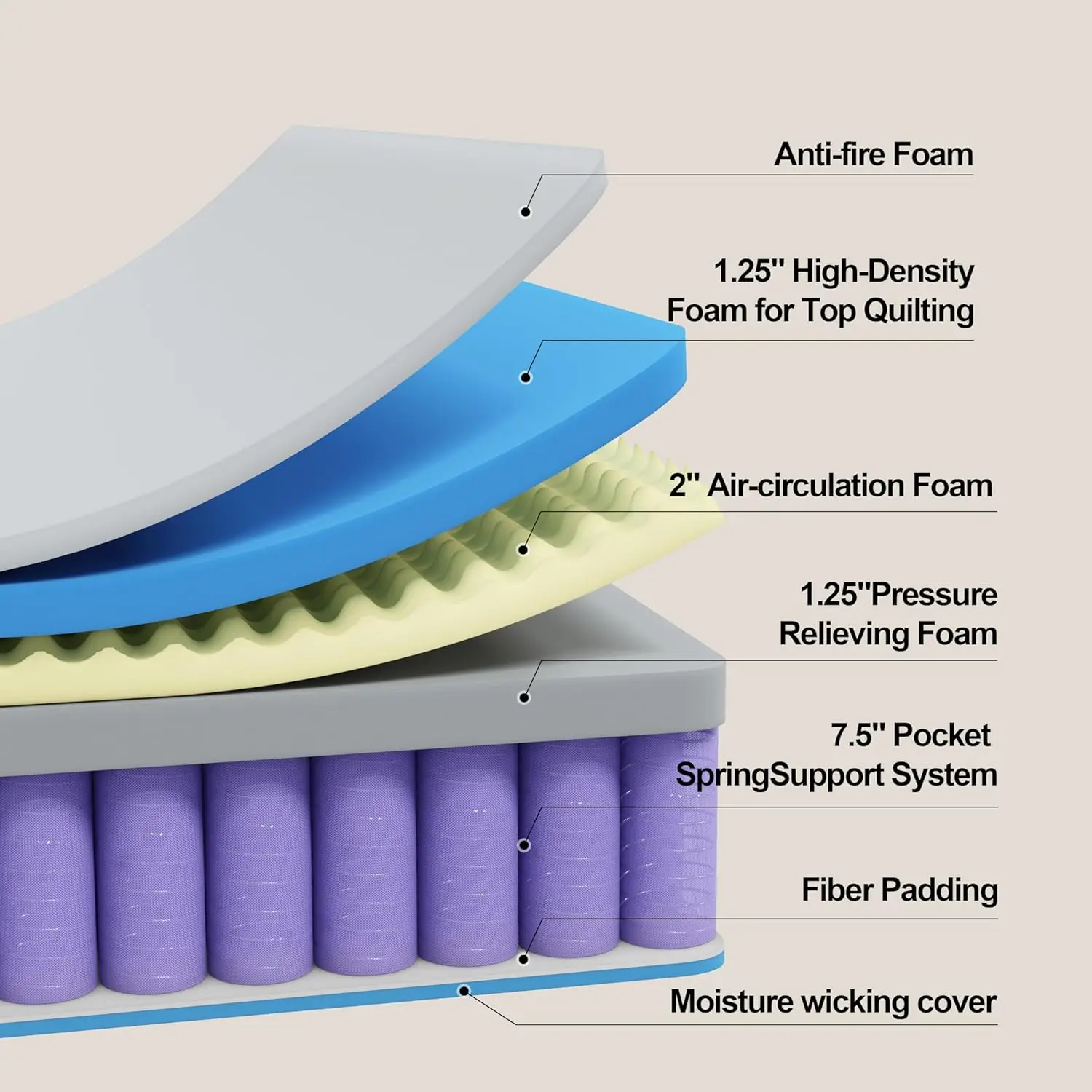 PRESSURE RELIEVING MEMORY FOAM: This california king mattress features MDI memory foam technology designed that easily conform to your body. The mattress consists of 5 layers of foam and pocket springs that can absorb your weight, relieve pressure, and block the innerspring so you will not feel the spring. All foam is certified by CertiPUR-US and fiberglass free, and the top layer foam and surrounding padding foam adpots fire retardant material, just to give the family a healthy and safe sleeping environment.